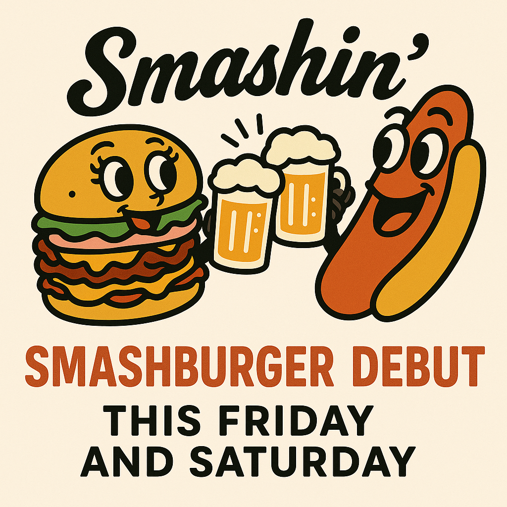 Smashin’ Smashburgers Now OpenFridays and Saturdays! Smashin’ Smashburgers Now Open!Fridays: 4pm-8pmSaturdays: 2pm-8pm Also Serving Pizza!Orders Taken From Noon Until 1 Hour Before Close$22 Pizza Special! Two Pints and a Pizza 7 Days a Week; noon-2pm